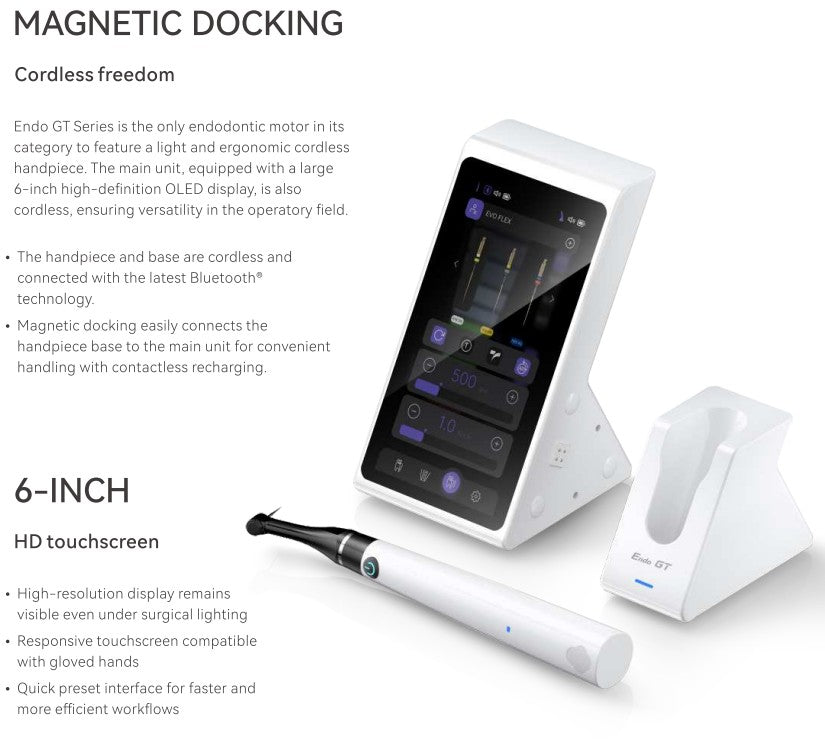 These cutting edge endo motors boast innovative features that have never been seen in endodontic science before. The Endo GT series is the only cordless handpiece and cordless base in its category of endo motors.
