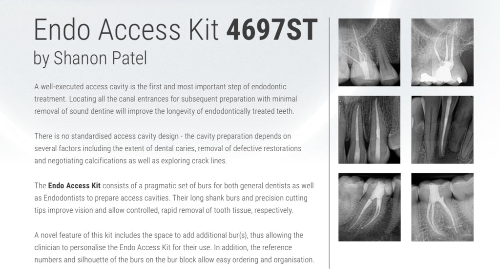 The Endo Access Kit by Shanon Patel consists of a pragmatic set of burs for both general dentists and endodontists to prepare access cavities.