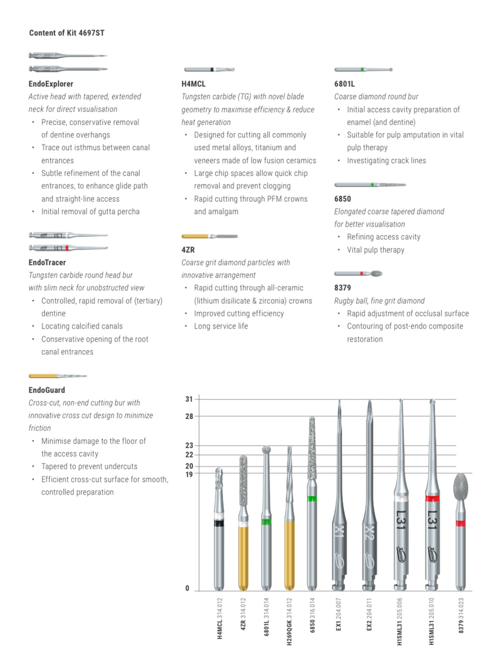 The Endo Access Cavity Kit is designed to support clinicians during access cavity preparation by combining specially developed burs that improve visibility and control. With a long neck and sharp cutting tips, the burs allow efficient and precise dentine removal while facilitating access to root canals for safer, smoother treatment.