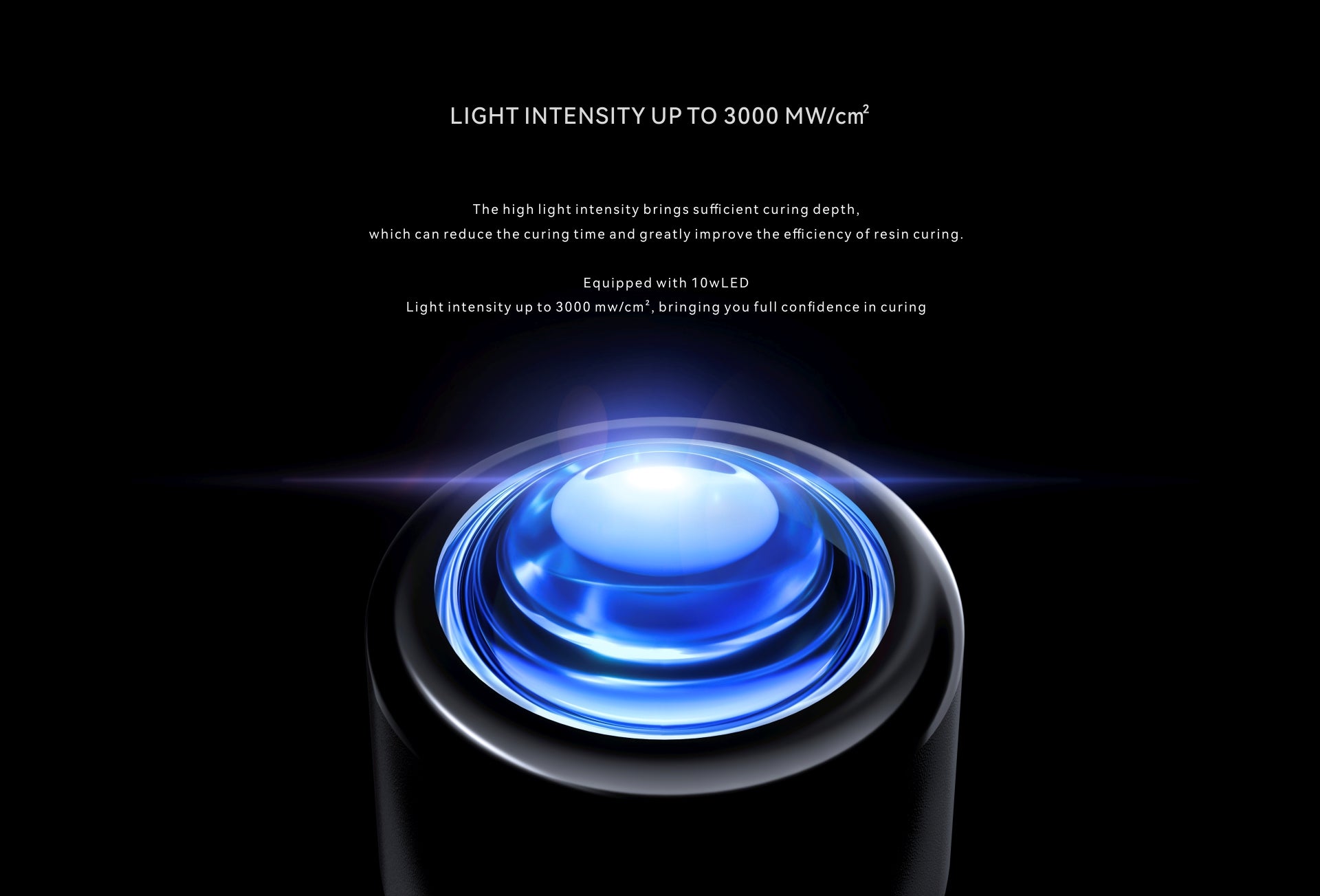 Ultra-high light intensity for minimal curing time, 2mm resin in 1 second.