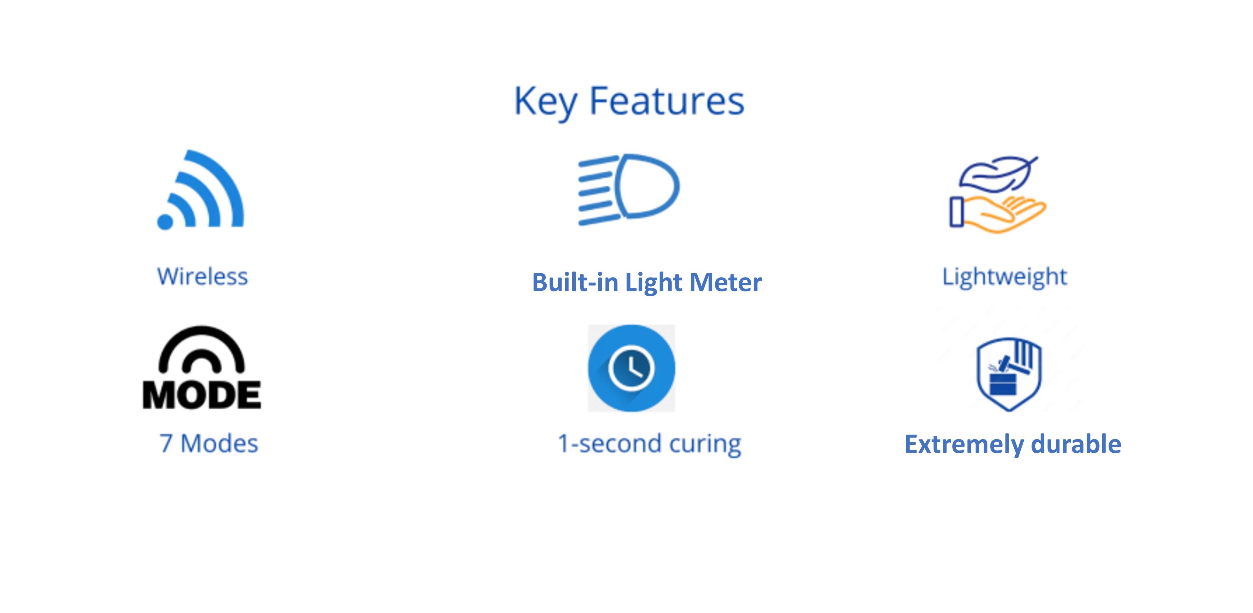 Specialist tested and approved wide spectrum curing light - The O-Star packs in a wireless design, 7 modes for specialist applications and a built in light meter for accurate light intensity measurement.