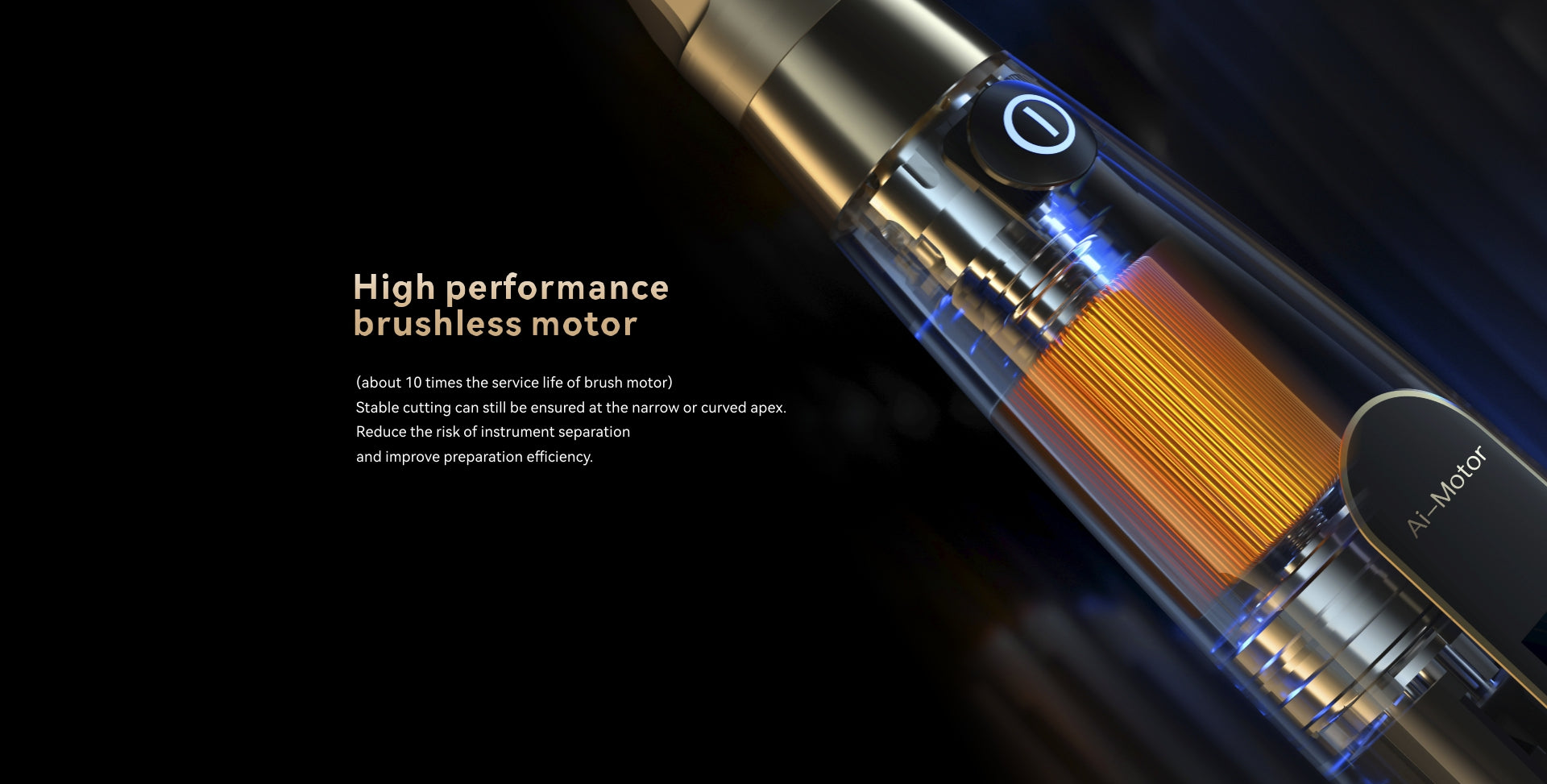 The Ai Endo motor is a cordless endo motor and has root canal measurement capability. It can be used as an endo motor for preparation and enlargement of root canals or device for measuring canal length.